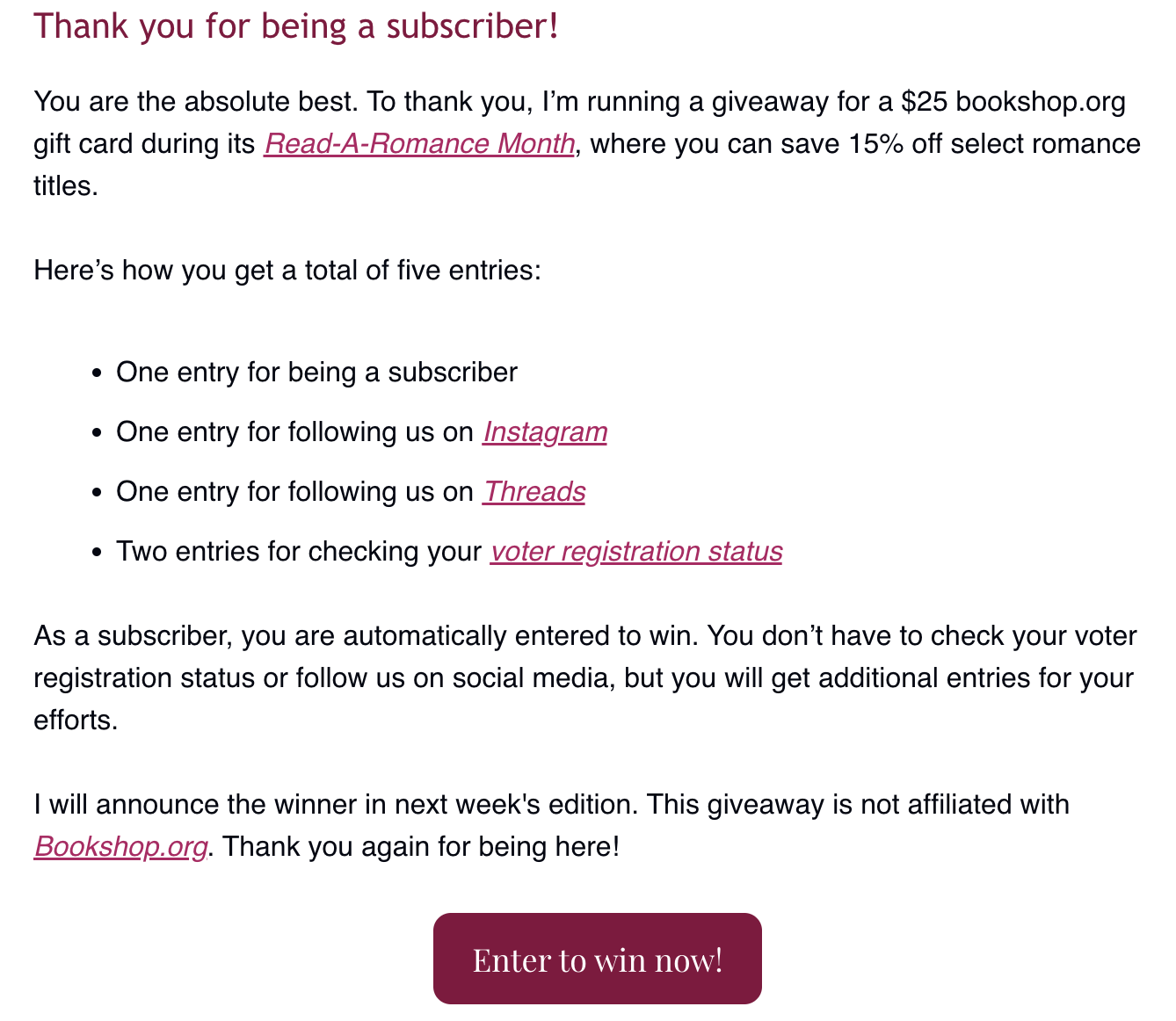 A bookshop.org gift card was an obvious choice for my audience. This would have been less successful had I gone with something unrelated to their interests. I wanted, more than anything else, more subscribers. I also wanted to make it really easy for people to enter to win.